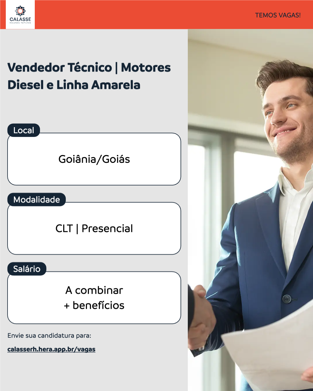 Atuação em Goiania/GO. O(a) Vendedor(a) será responsável por atuar no departamento Comercial, atendendo clientes e identificando suas necessidades para oferecer soluções adequadas. Este profissional deverá desenvolver habilidades de negociação, manter o relacionamento com a carteira de clientes e acompanhar o processo de vendas, utilizando ferramentas de CRM para registrar informações e resultados. É fundamental ter boa comunicação e proatividade, contribuindo assim para o crescimento das vendas e a satisfação dos clientes. Imprescindivel que tenha atuado com vendas de motores diesel e peças para linha amarela, agrícola.